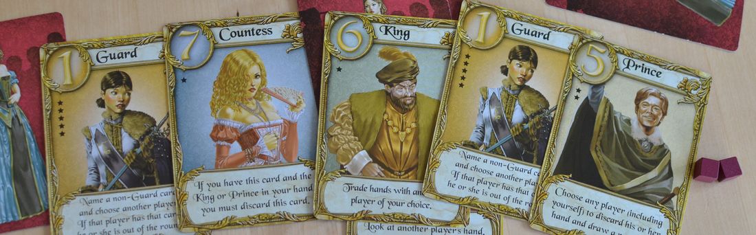 The game consists of a deck of 16 cards featuring different characters from the Royal Palace numbered 1-8. There are five ‘Guard’ cards (number 1), pairs of cards numbered 2-5, but only one of each of the higher numbered characters such as the Countess (7) or King (6).