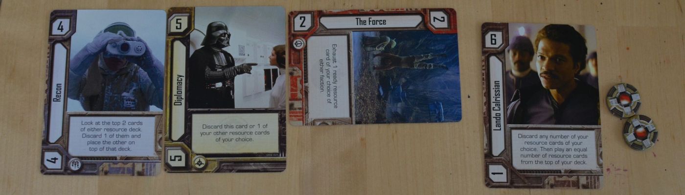 Each player has their own deck (Empire or Rebellion) comprising resource cards that include key characters, valued between 1 and 6, which are used to build a player’s total for each event battle. The resource cards have various special effects which can be used during the battle, such as removing cards played by your opponent, and once resource cards are spent they can be revived again through tokens collected from winning previous battles. However, some event cards also nullify the use of certain resources when building your total value – for example in Duel on Cloud City only the character powers of Darth Vader and Luke Skywalker can be used during that battle.